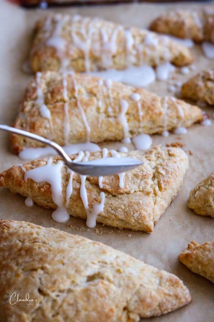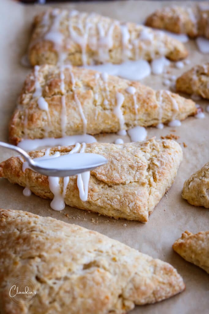 Once the scones have been removed from the oven and cooled off, use a small spoon to drizzle the glaze in a zig-zag pattern onto each scone. Repeat for each scone until they are all glazed.